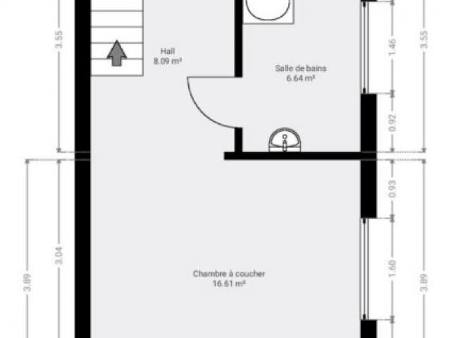 Composition : porte d'entrée au 2ème étage s'ouvrant sur grande pièce de vie ouverte de 33 m² avec cuisine équipée. Escalier interne vers 1er étage composé d'une chambre à coucher, une salle de bain et un espace rangement/buanderie.